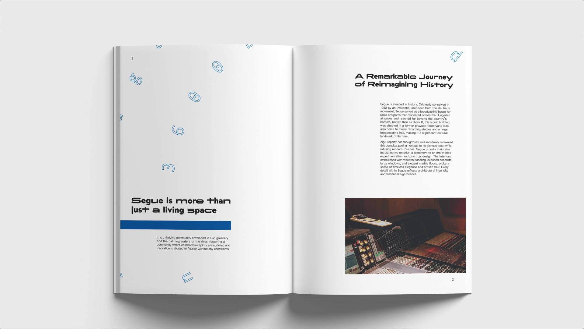 Zig Property needed a concept-driven brochure for Segue, a Bauhaus-era Budapest broadcast house converted into residential apartments.