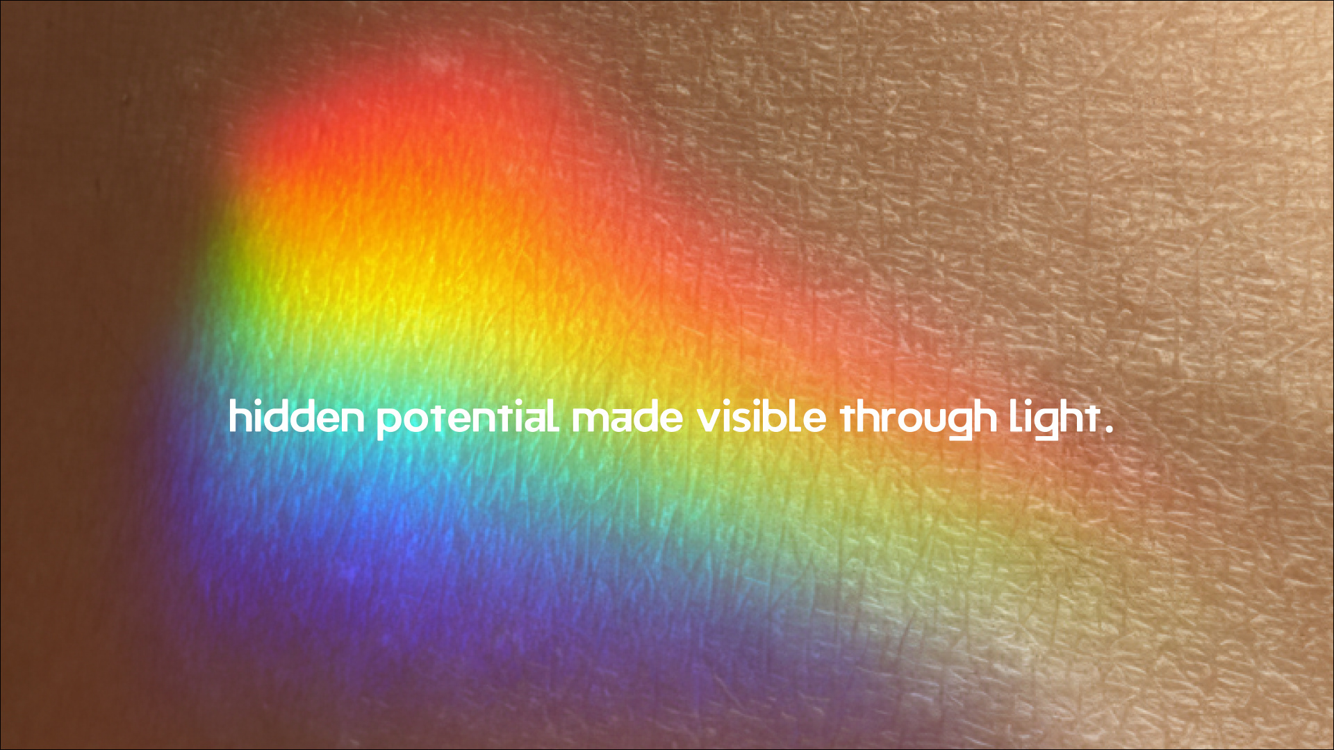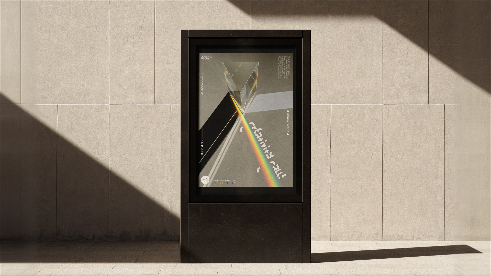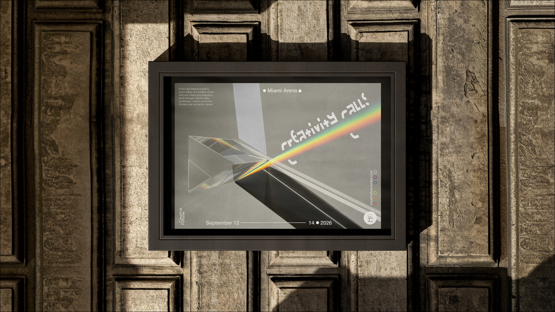 A glass prism concept was developed and photographed to use refraction as a metaphor for how the festival reveals hidden potential in young creatives, refracting a closed industry into a visible, inclusive spectrum.